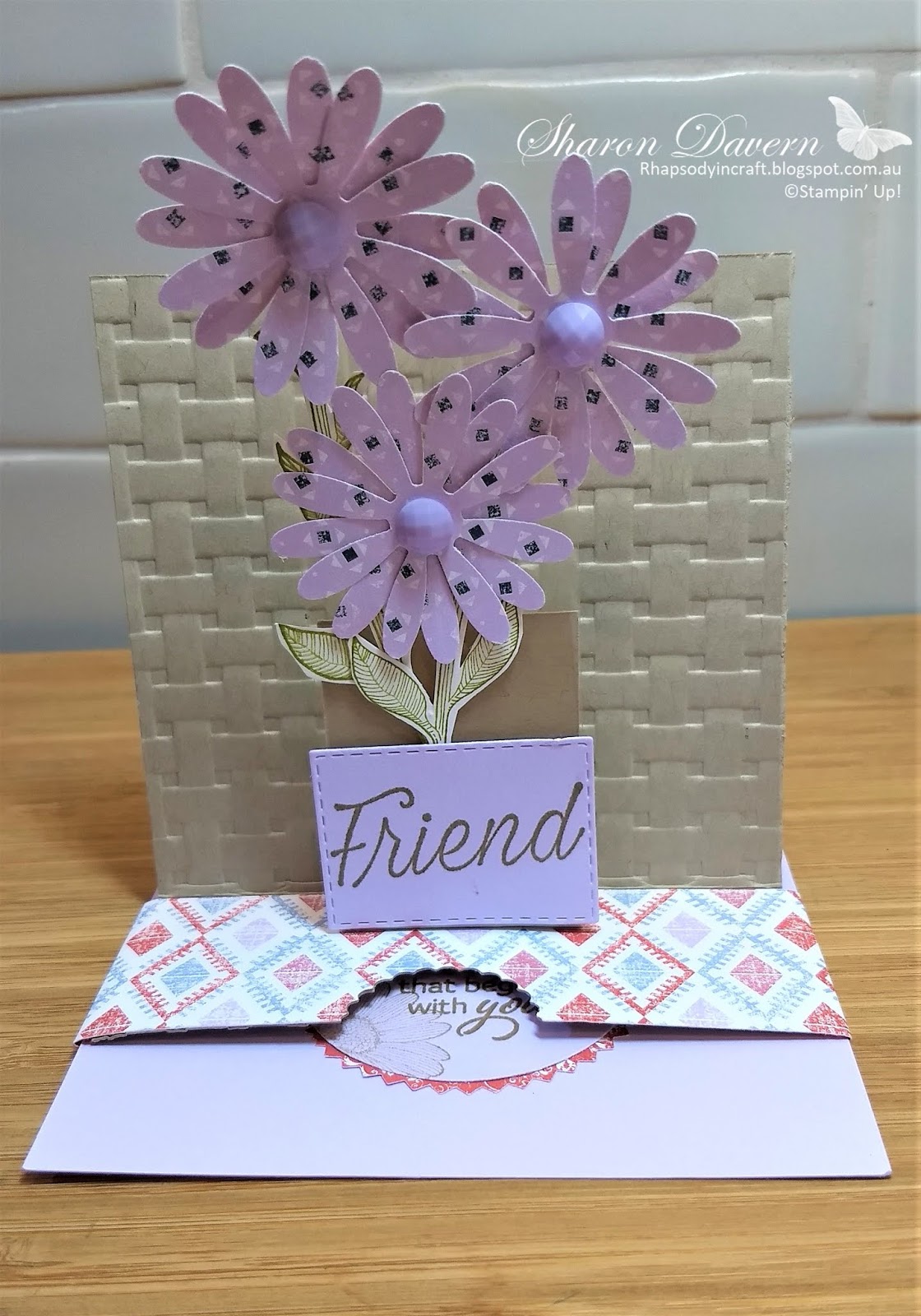 Now I have one more step up of this card for you to see. I have stamped the daisies on some whisper white card stock but have used the new in colour Rococo Rose as the card base to this card.