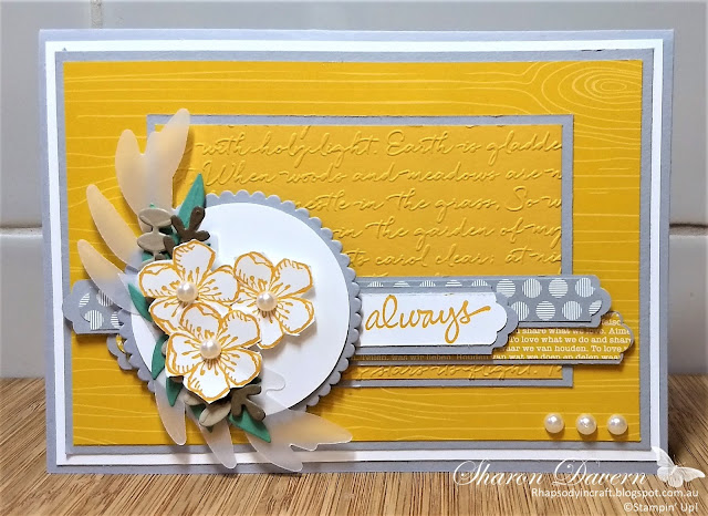I have used Smokey Slate and Crushed Curry as my 2 main colours and I have used the Regals and the Neutrals 6x6 DSP stacks for the added interest in the card tonight and of course I love the Scripty 3D Embossing folder. I have layered the DSP with the Smokey slate after stamping the word "Always" from the Lovely You stamp set by using the Lovely Labels Pick a Punch
